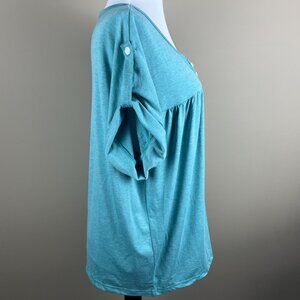 Elizabeth Kelly NWT Short Sleeve Blouse Plus Size 2XL Green, V-neck, Partial Button Down, Roll Tab Sleeves, Gathered Across Chest, Stretch