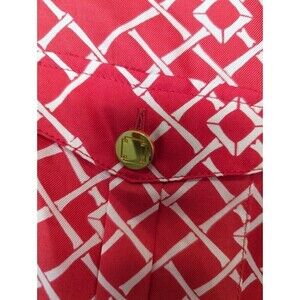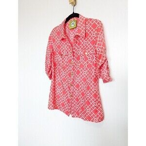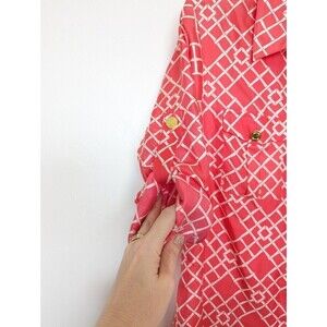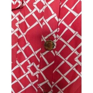 Elizabeth McKay silk blouse in excellent pre-owned condition. No size tag, but compared with other tops in this style, it fits like a women's size 6. Pink and white geometric print with gold buttons and roll-tab sleeves.
