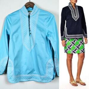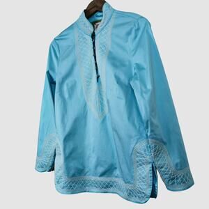 Elizabeth McKay Size 4 Tunic Gold Buttons Embroidery Turquoise Blue