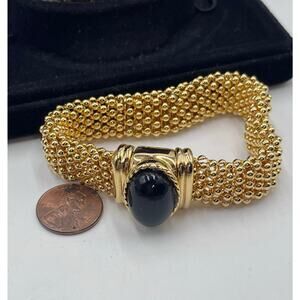 Diamonds. The metal color is gold and the bracelet has three interchangeable oval cabochons in pearl white, ebony black and regal deep purple. Each cabochon is magneticized and snaps into place between the magnets at the end of the bracelet