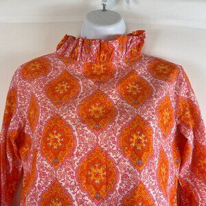 Elizabeth Wilson Mandala Floral Print Top XS Orange Pink White Ruffle Collar Sleeve