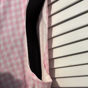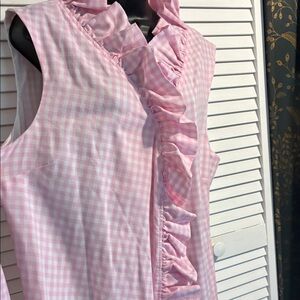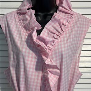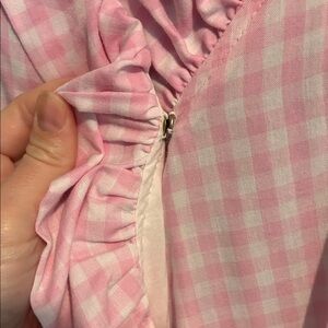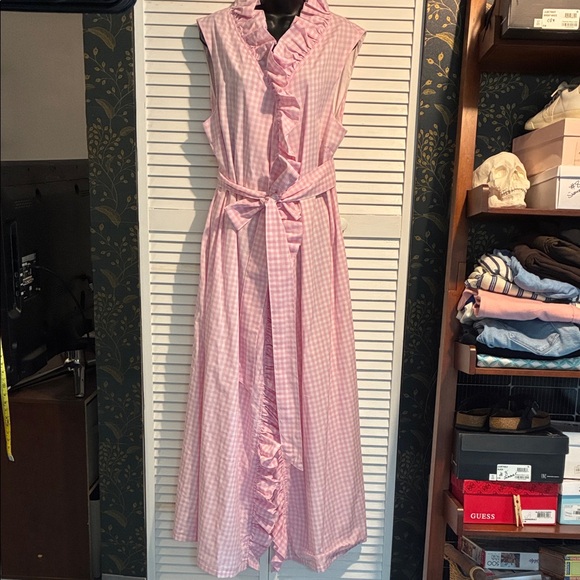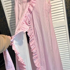 Long beautiful maxi dress with sash. Gingham cotton blend fabric with cotton lining. No pockets. Ruffle all the way down both sides of front of dress. Cute!!!
