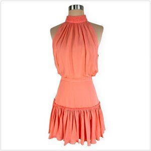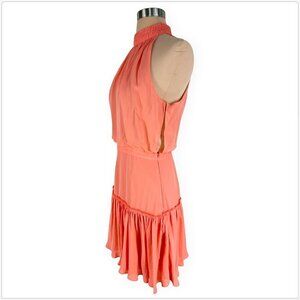 Fully lined. Side hidden zipper with hook and eye closures. Smocked collar. Keyhole back with button closure. Ruffled trim. Mini length. Light orange sherbert color.