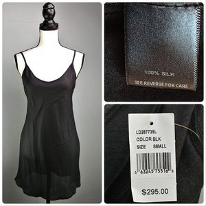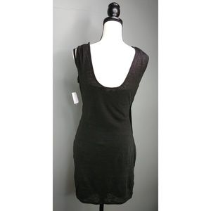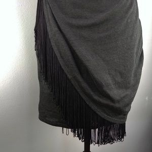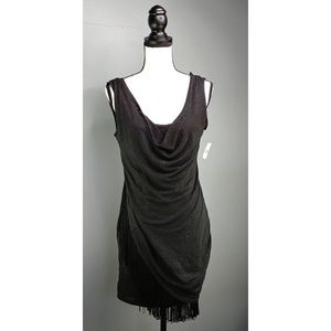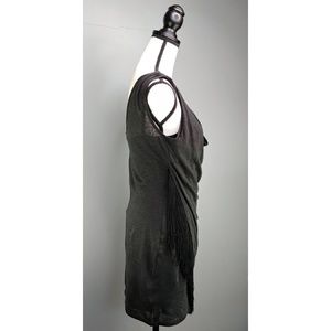 Elizabeth and James sleeveless linen sheath cocktail dress with fringe. Front of dress has a straight hem linen layer with fringe sewn onto it, overlaid with the draped linen layer. Underneath, straps secured to the shoulders with string & snap, is a black silk slip with with adjustable straps. Lightweight.