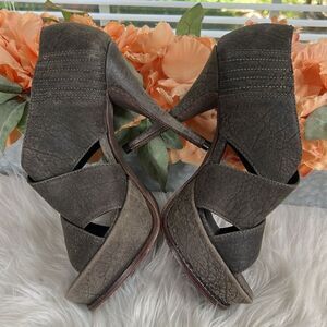 Gently used gray textured Elizabeth and James E-milla platform sandals. Slip on. 1 1/4" platform and 5 1/4" heel. Stitch detail on heel. Size 8.5.