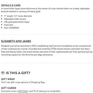 Adjustable 24k gold-plated bracelet by Elizabeth and James. Semi-precious white topaz accents the gold charm. MSRP: $135 + tax.