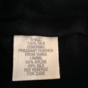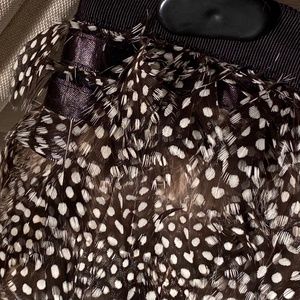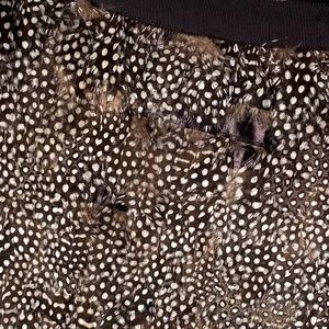 Pheasant feather covered silk miniskirt by Elizabeth and James. 1” grosgrain band at waist. Hidden 5 snap and single hook and eye closure at side. Fully lined. Good, used condition. Some feathers missing and 1/2 of the bottom snap missing (see photos). Otherwise, this designer stunner still has lots of life left. Mannequin images are stock photos for fit reference only.