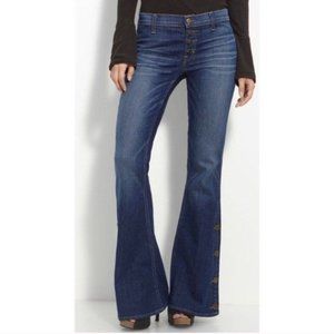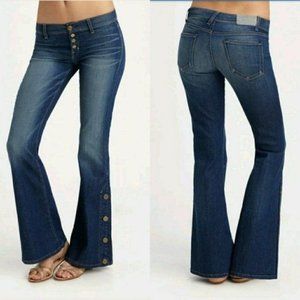 On trend mid-rise flare jeans with an exposed button fly and button detailing on the flares. Medium wash denim with a bit of stretch, 2 back pockets with a subtle, intentional distressing and some whiskering on the front by button closure. These jeans are sold out at Revolve.