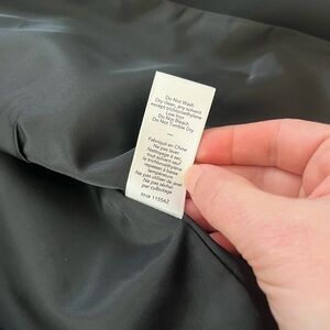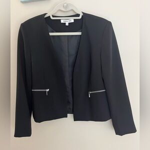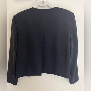 Polyester blazer. Hangs open. Has shoulder pads. Some wear and pilling in shoulder areas. See photos for dimensions.