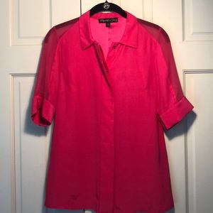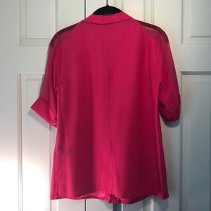 100% Silk hot pink with hidden and sheer panels on the sleeves. Great condition, only worn once!