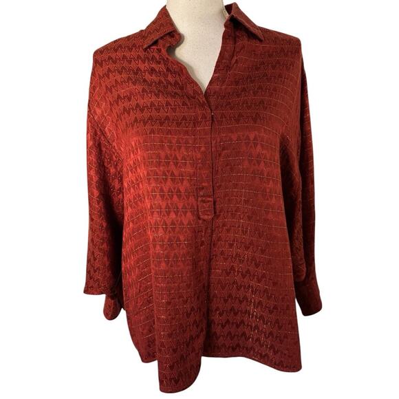 Chic red blouse with geometric patterns. Features a classic collar and button-up front. Ideal for versatile styling.