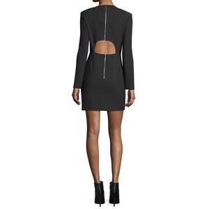 Gently worn long sleeve mini sheath dress by Elizabeth and James in a solid black colorway. This otherwise demure style dress reveals an open lower back cut-out for an unexpected update.