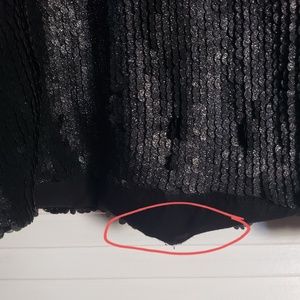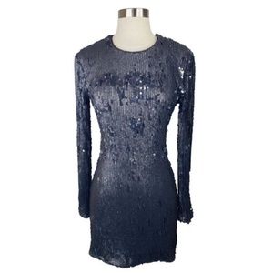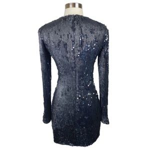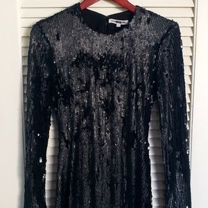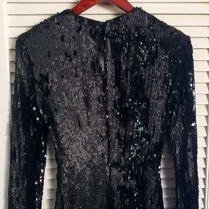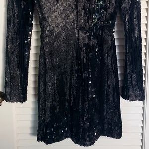 Elizabeth and James Siggy Dress in very good condition. Size 6 with Retail value of $495. Measurements are approximate: Pit to pit 17” Shoulders 16” Length 33” Sleeves 24” Flat lay waist 12” •Black sequins on mesh that do go in both directions so you get a variation of pattern looks •Stretchy through the waist •Sheath •Long sleeves •Crew neckline •Hidden back zipper with hook-and-eye closure •Fully lined •Imported •80% Polyester, 17% Rayon, 3% Spandex *Stock photo to show fit/style - the remaining pics are of actual listed item **This dress is in very good condition - the bottom hem just needs to be fixed because it is loose, it is circled on the picture. Looks like it could easily be hand stitched or even taped since it is a small section. I have priced it close to what it is just to rent it on websites.