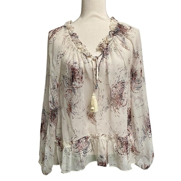 Elizabeth and James silk blouse, boho chic top, romantic peasant blouse, sheer ruffle blouse, tassel tie blouse, lightweight silk top, feminine designer blouse, Olsen twins fashion brand, Elizabeth & James women’s top, flowy boho blouse, festival style blouse, date night top, luxury silk peasant shirt, modern bohemian blouse, elegant NY designer top, career chic blouse, airy romantic blouse, cream silk printed blouse, elevated feminine fashion, timeless Elizabeth and James blouse
