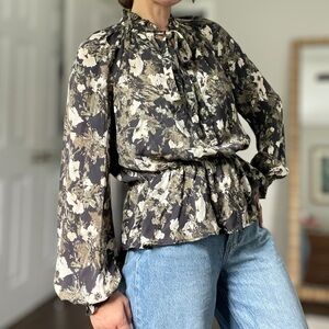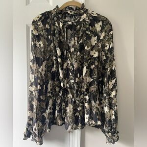 Elizabeth and James 100% Silk Tie Front Blouse. Gorgeous for fall, this blouse has a foliage like pattern in dark greens beige and black. Size small. Very good condition, one sleeve button is broken in half but still functional and one extra button is included if you want to replace it.