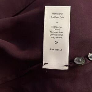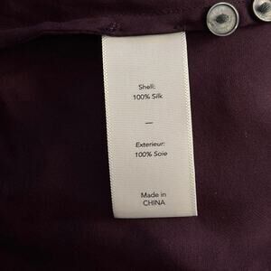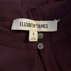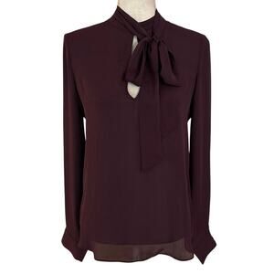 Elizabeth and James 100% Silk blouse in a beautiful eggplant purple color. Keyhole opening with attached neck tie. Long sleeves. This top is somewhat sheer so you would probably need to wear a cami under it. Seems to run a bit small. Size Large. Preowned, no flaws.