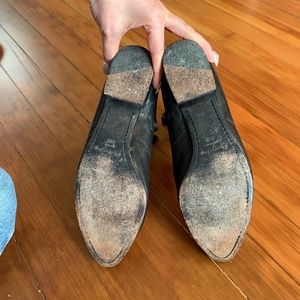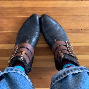 Beautiful 3 buckle black and brown Elizabeth and James booties with gold hardware. Side zipper. Some scuffs at toes and heels. Black stacked heel. soft leather, leather insole, leather sole. super nice quality. Worn but still nice. True to size.