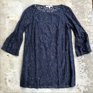 Navy blue Lace shift dress cover up. Dress does NOT have slip. swingy, lightweight shift, dress. 3/4 Flouncy bell sleeves. Pullover style. Measures 20.5” across the waist, 32” total length.
