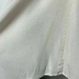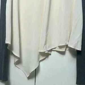 Cream colored silk long sleeve shirt with asymmetrical hem and grey sleeves and collar