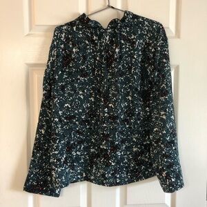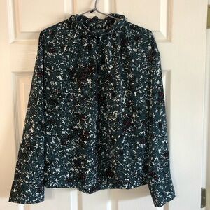Size Medium. Beautiful colors Irina Petals - teal, red, black, and white floral print. Mock neck, long sleeved relaxed fit. Shirred front,Concealed back zip closure