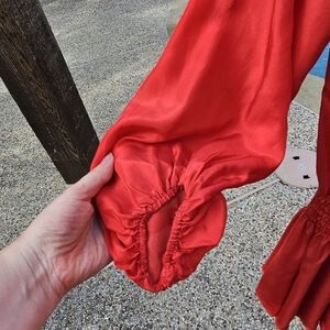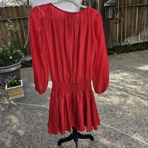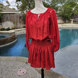 trimmed neckline dress in 100% silk with gathered, waist. Long sleeves . Slip-on dress.