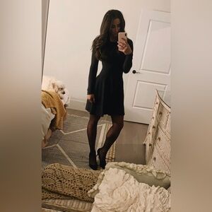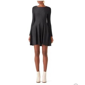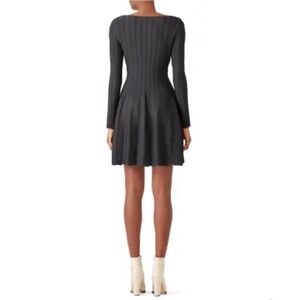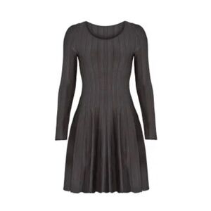 Grey knit (70 Viscose, 28% Nylon, 2% Spandex). Hourglass. Long sleeves. Boat neckline. 36.5" from shoulder to hemline. Imported.