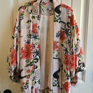 100% Silk Elizabeth & James kimono with vibrant floral patterns. Has pockets, Stylish and versatile.