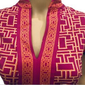 Elizabeth McKay Dress Orange Red Geometric Print Pullover Mock Neck Belted Sz XS