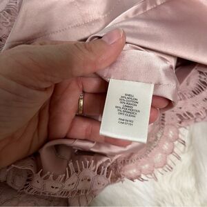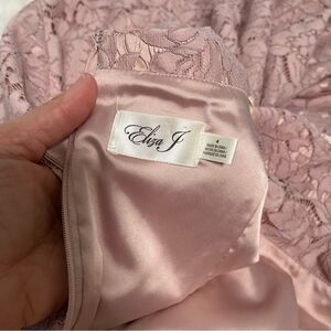 Beautiful blush pink lace dress by Eliza j. Features pretty ruffle design at top of dress and scalloped bottom hem. Back zipper. Off shoulder design. Great preowned condition without any significant flaws. Lying flat armpit to armpit approx 16” across and top of bust to bottom hem approx 35”. All measurements are approximate