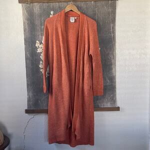 Orange Knit (30% Cotton, 27% Merino Wool, 18% Polyamide, 17% Polyacrylic, 8% Recycled Polyester). Cardigan. Long sleeves. Front pockets. 42" from shoulder to hemline. Imported.