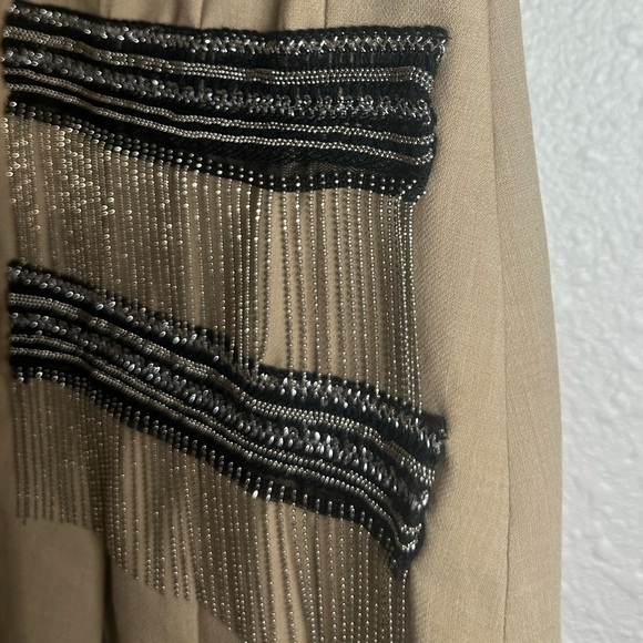 NWT Ellie Makir Women’s Camel Midi Skirt, Size Medium, is new with tags, and features beaded accents and a pull-on plus zip-up design.