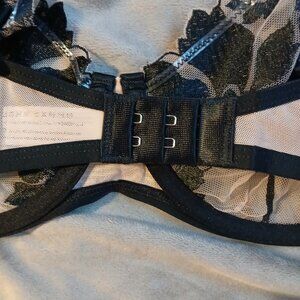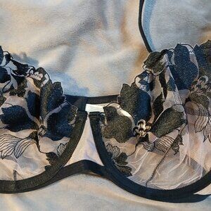 Features: sheer mesh and black floral lace, floral embroidery, underwire unpadded cups, slim adjustable straps, hook and eye closure, scalloped edges