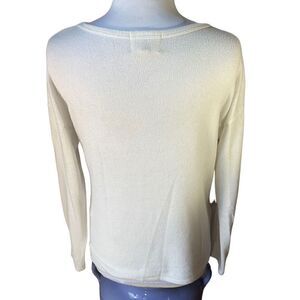 Casual Ella Mara Hacci Stripe Sweater by Anthropologie, Size Small. Cream scoopneck withmauve, navy, mustard and grey stripe across chest. Longsleeve. Scoopneck. Vented. Slight Pilling- but that is the nature of the fabric. Flat lay 22” p-p, 25” L. . 62% poly, 33% rayon, 3% spandex. Super cozy. #anthro #mature #casual