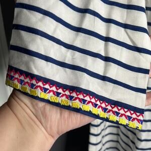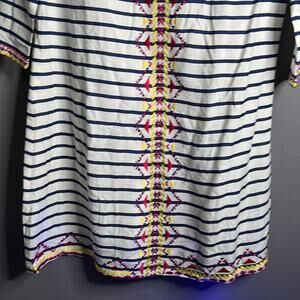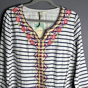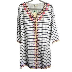 This NWT Ella Moon blue and white stripe print emphasizes a classic and fresh appeal. The tunic style dress has a relaxed and comfortable fit. The vibrant and intricate embroidery detailing adds a pop of color and unique charm. Fully lined and side zipper.