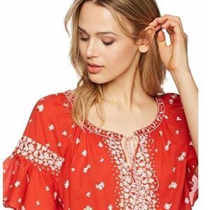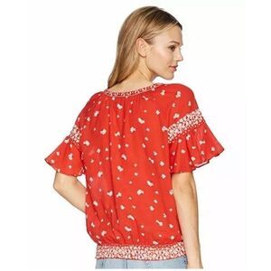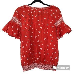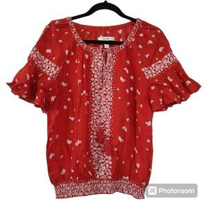 ✨Ella Moon Top Boho Sz Large Shirt Red Smocked Waist Ruffle Sleeve Tassel Tie✨