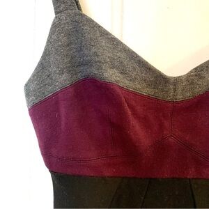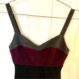 Cute mini dress in black, grey, and burgundy. Cotton jersey knit. This dress is versatile, comfortable, and effortlessly stylish. The cut of the bodice is very flattering! Great condition, very gently worn.