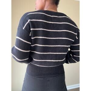 Ella Moss black and light pink striped button down cardigan. This V neckline comfy knit is perfect for layering and is super soft. It has balloon sleeves and is a cropped length. This cardigan is effortless and is perfect addition to a casual look.