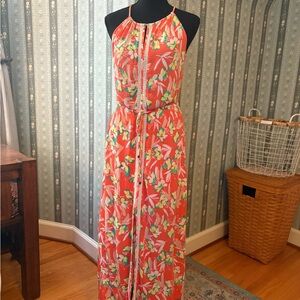 Step into resort-ready style with the Ella Moss Pink Halter Slit Maxi Sundress. This sleeveless dress features a chic halter neckline and a stylish slit, perfect for warm weather getaways.