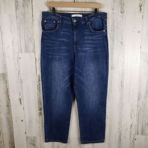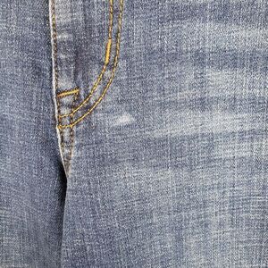 ~ Description: Medium blue wash, high rise, straight leg, classic 5 pocket style, intentionally distressed