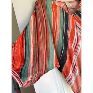 Ella Moss blouse in size XS, sold by Anthropologie. Half-length dolman sleeves, V-neck, lightweight and flowy. Soft multicolor stripe pattern features green, orange, white, and black in a chevron/V layout.