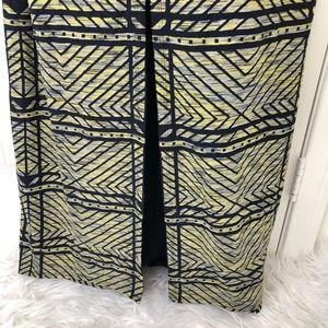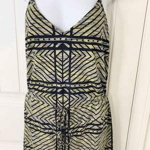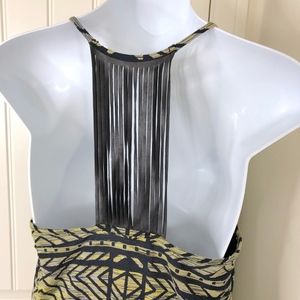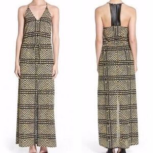 Ella Moss yellow and black Soleil print Kayla split-front maxi dress with black faux-leather strappy back detail. V-neck racerback. Slip-on style with drawstring waist.