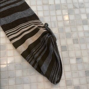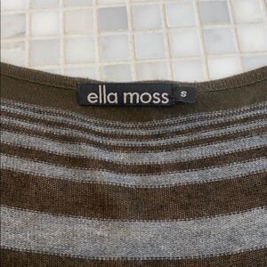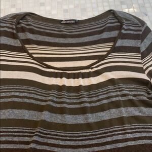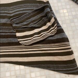 Ella Moss Green Striped Top with button sleeves and asymmetrical bottom. Long top. Pockets. Rayon. Good used condition.