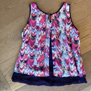 Abstract print tank with split back. Layered top with navy lace. Back button closure.
