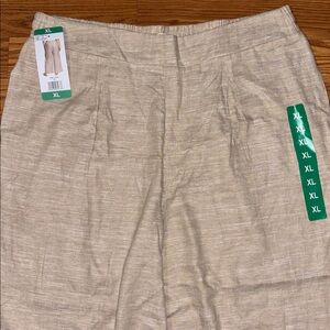 Chic light tan pants with elastic waistband. Ideal for everyday comfort. Brand new made of linen and viscose , waist 39” rise 16” inseam 25”