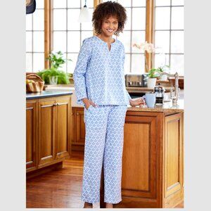 These lightweight, cooling pajamas are made of breathable woven cotton in an easy-to-wear style. The pajama top has a boxy, free-flowing fit and is finished with a V-notch neckline and side-slit hem, and the matching pajama bottoms have a full elastic waist, wider legs, and side-seam pockets. The pajama set is the perfect weight for all-season wear.