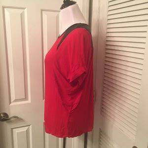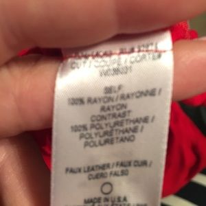 100% Rayon with faux leather triangles and collar detail. Fun and eclectic top with shaper Dolman style sleeves. Length is 24.5 in and 16.5in across. Dry clean only.