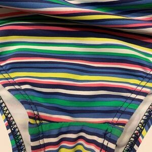 Ella Moss multicolor striped bikini bottom, size medium. Fold over waistband. Thin stripes in pink, blue, green white & yellow. Moderate to full coverage in back. Measures approx 15.5” waist laying flat and unstreched. In excellent used condition, last pic shows most significant sign of wear, small snag hidden by waistband. Looks great with solid color top. Photos are a part of the description. Color may vary with lighting/device.