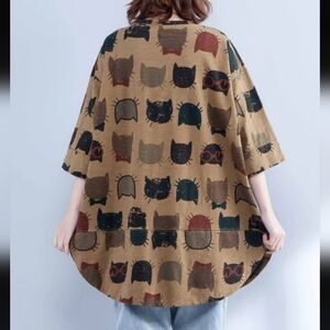 EllaZhu Brown Cat Short SleeveBaggy Tunic Shirt Womens Size One Size