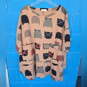 EllaZhu Brown Cat Short SleeveBaggy Tunic Shirt Womens Size One Size pockets front.