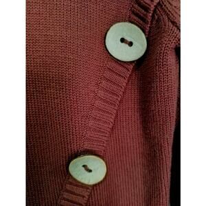 This is a cute chocolate brown crew neck, faux wrap sweater. It has large decorative wooden buttons and ribbed edges.